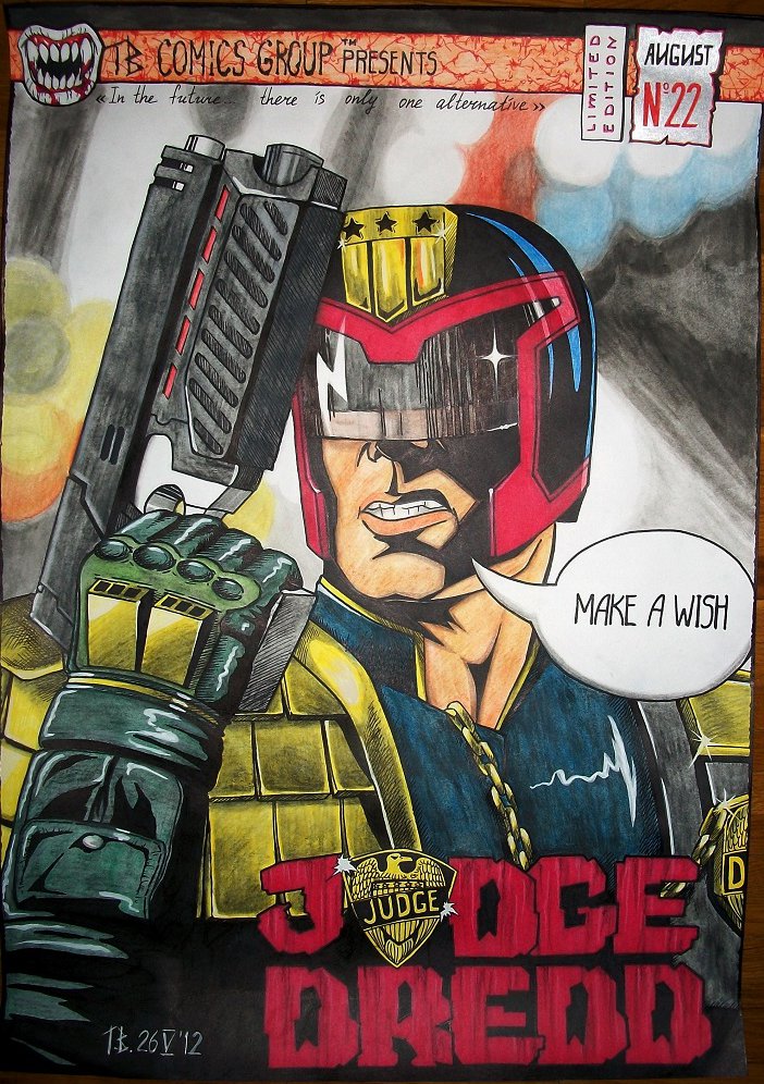 Судья Дредд. Использованы: карандаш, маркеры, гуашь, акварельные карандаши, гелевые ручки. Формат А2.