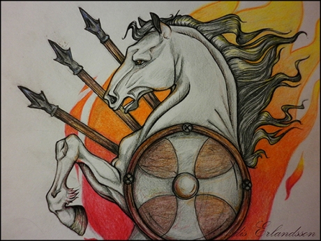 Эскиз конь белый пламя копьё щит боевой