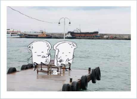 хлеб тосты море крым ялта корабли кормить птиц крошки грустный весёлый коллаж
