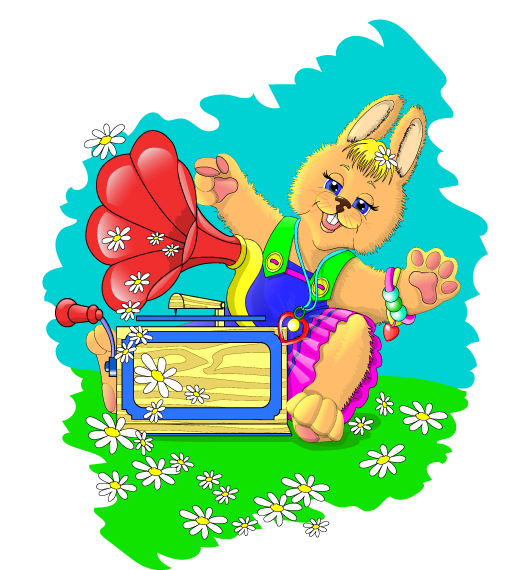 Кролик в разноцветном сарафане и патефон.