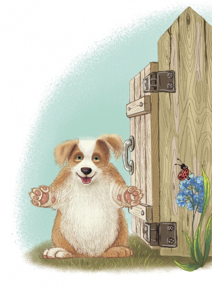сказка иллюстрация щенок лапы лето калитка ворота ловить цветок букашка
