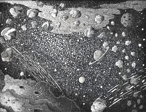 Фантазийная композиция, выполненная в графике с помощью линеров и маркеров различной толщины а так же белой ручки.
