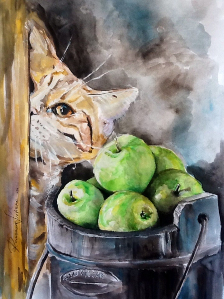 кот с яблоками