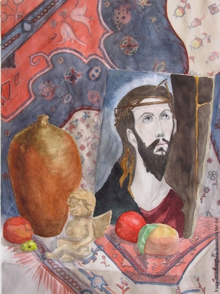 Натюрморт, состоящий из нескольких предметов: фруктов, горшка, статуэтки ангелочка и копии фрагмента картины Эль Греко "Христос, несущий крест"
