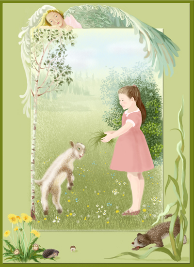 девочка козлёнок лето ангел ёжик собака берёза куст