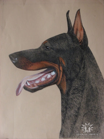 Портрет добермана. 30х40;Бум.,тушь,акв.карандаши.