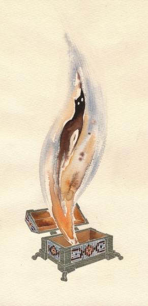 Иллюстрация к книге Ахмета Умита «Шкатулка сказок» (книга вышла в издательстве "Нигма" в 2016 г.). Выполнена акварелью в сочетании с гуашью и бронзовой краской с имитацией традиционной турецкой живописи по воде "эбру".