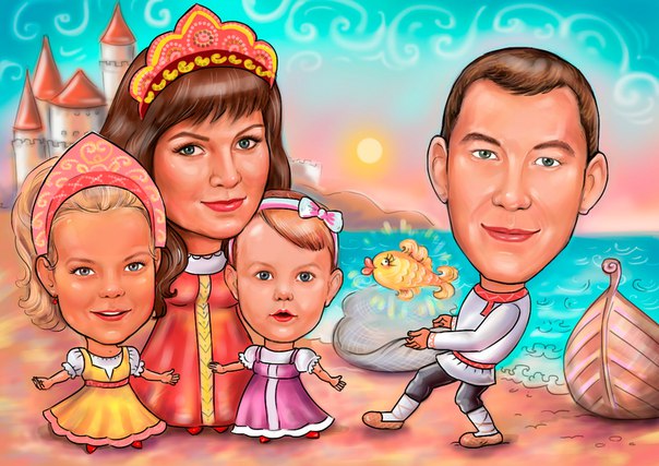 Милая семья. Отец - добытчик. Мама - царевна. И две красавицы-дочки . Иллюстрирует не легкую, но приятную мужскую обязанность.
