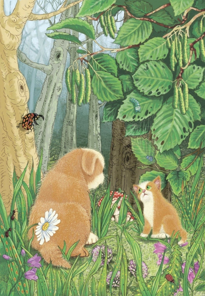 иллюстрация сказка лето трава цветы грибы лес деревья лето паутина паук жучок ольха сережки ромашка колокольчик
